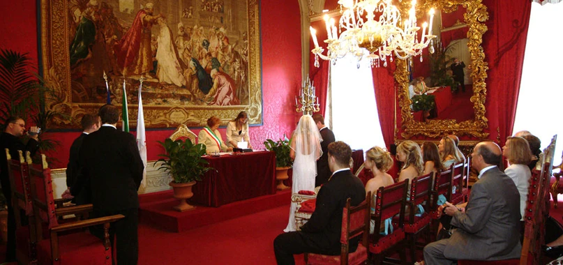 Civil ceremonies take place in town halls, which are usually ancient palazzos or museums. The service is performed in Italian and translated by an interpreter and it lasts about 15-20 minutes. After reading the civil vows, the couple sign the wedding act, together with the witnesses, and receive the wedding certificate in several copies, which has legal validity throughout the world.