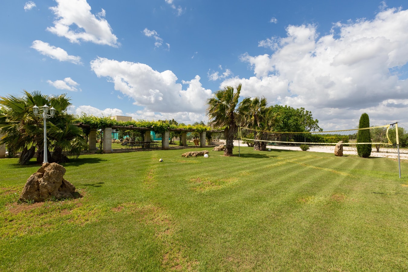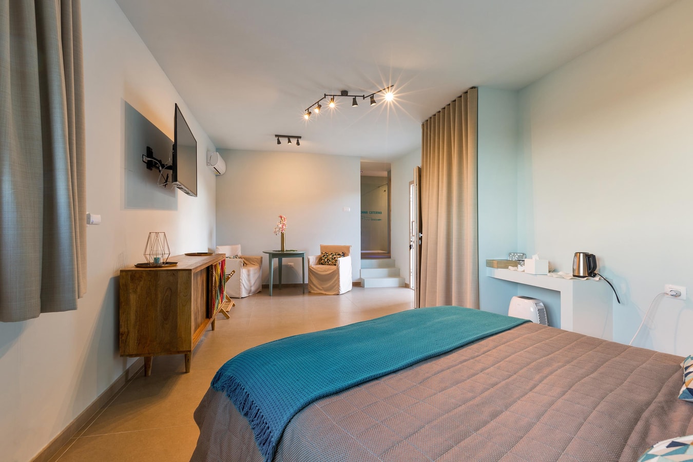 The sleeping area consists of: one master bedroom located on the first floor with external access only, hot tub Jacuzzi in room, little fireplace and en-suite bathroom with shower, as well as a little private terrace. The other five bedrooms are located on the ground floor; they are 4 double bedrooms and one triple bedroom with one double bed and one single bed. All the bedrooms have air conditioning, en-suite bathrooms with shower, and LCD TV.