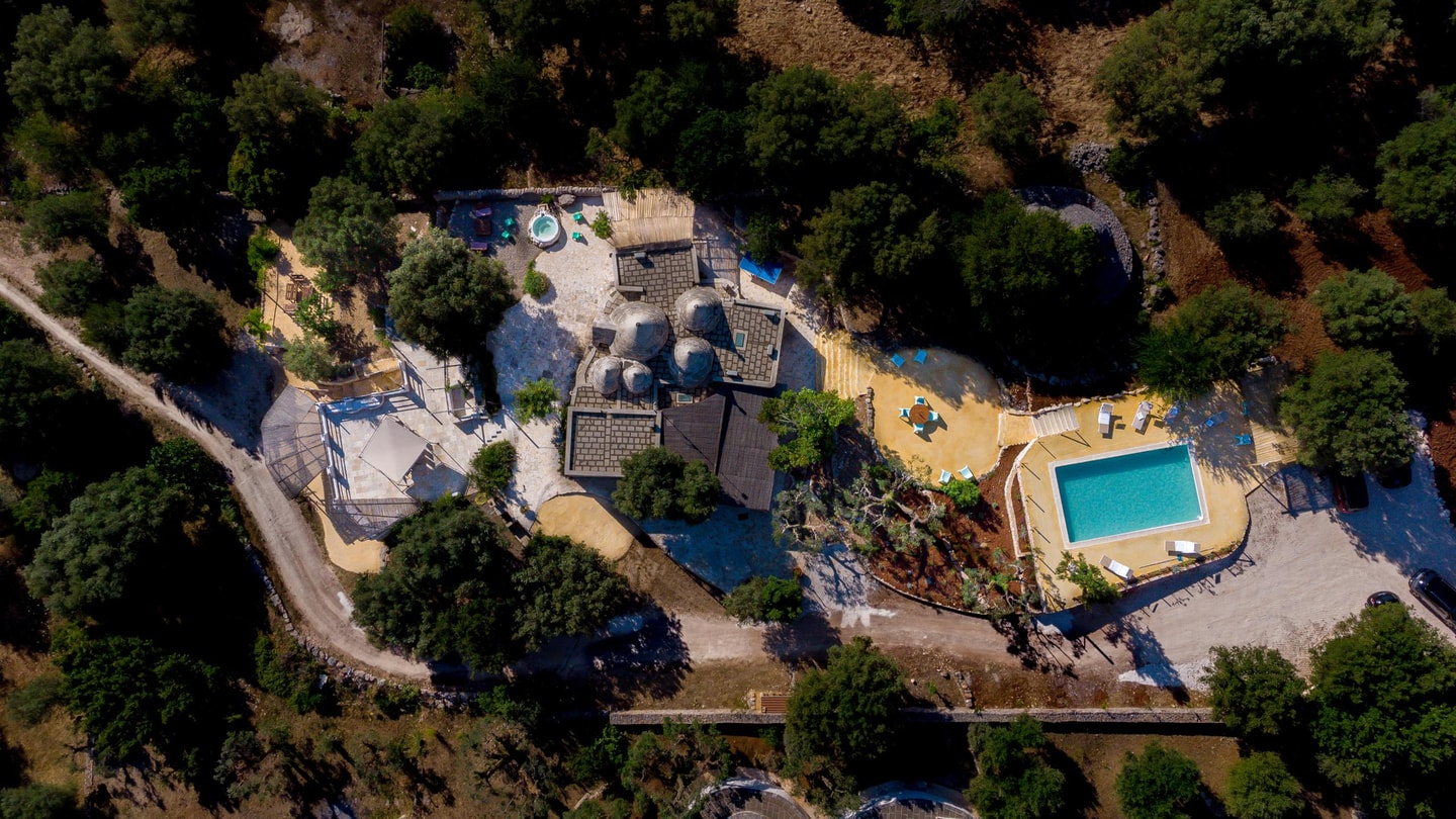 This resort is composed of two Trulli houses, the roof of the second being the terrasse of the other. The structure is amazingly beautiful, giving you the feeling of a desertic Tatooine village. The area is extremely quiet, surrounded by a sea of olive trees in all directions. There is a gas station at less than 1 kilometers, with a small shop\/bakery. So that is very useful if you need to buy small stuff on the fly. The shop is opened from 6am including Sundays, so every day you can have fresh bread and croissants for the breakfast. The inner swimming pool is a bliss, hugely appreciated by kids and parents alike, also for the air conditioning that is a delight when the outside temperature is 40 degrees. Please note the running water cannot officially be drank. This was not a huge problem for us, as you can still cook, brush your teeth, wash, etc. But it does mean you have to buy a big quantity of water bottles. Our contact Leandro was very helpful, allowing the checkin and checkout to go very smoothly.