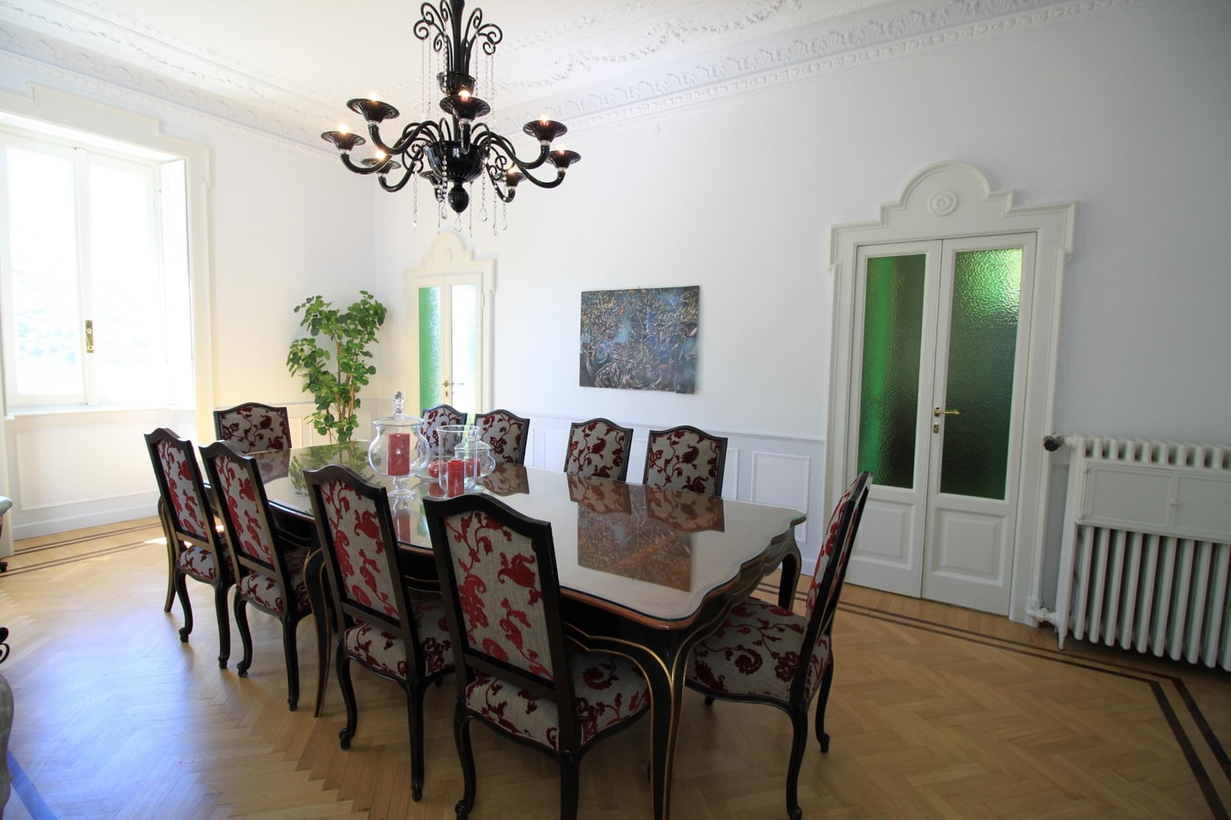 Outside, you will find a private lakefront garden with lush lawns and expansive terraces. Here, you will find a private swimming pool (measuring 10 x 4 m; 1.5 to 2.5m deep; heated on request at extra cost; open 1 April to 30 October) with a sun terrace. Additionally, there is a shady alfresco dining spot, a jacuzzi hot tub (for up to 7 guests), and a covered private parking area (for 5 cars) equipped with a charging station and an elevator that takes you to the ground floor.