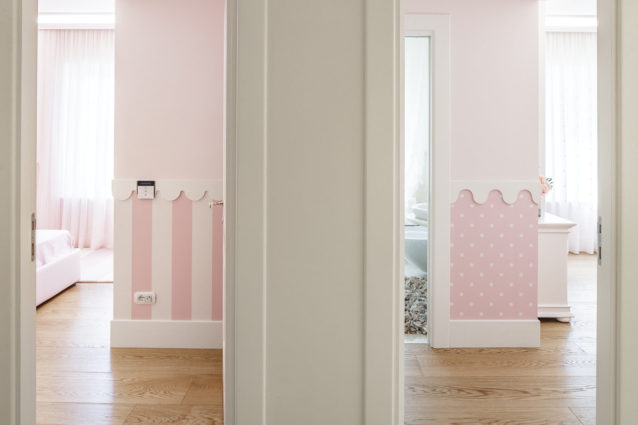 A wooden staircase takes us to the first floor, where we find a double bedroom (non divisible) with en-suite bathroom with shower, and one single bedroom (pink) with bathroom with shower.