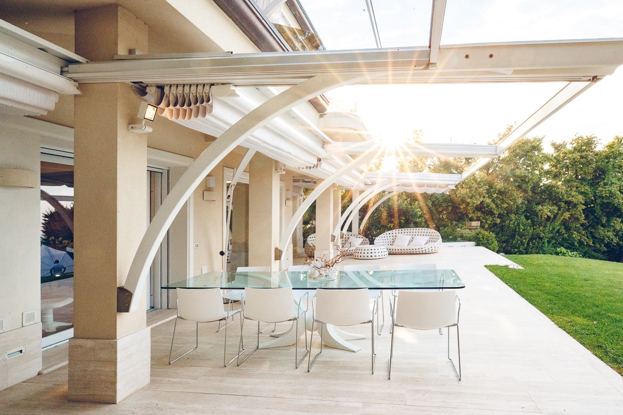 Outside, the villa offers a lawned garden (1200 sq.m) with plants, flowers and trees, an open-air gym, precious onyx back-lighted fountain, hammock, gazebo and many relaxation areas. The private swimming pool is one of the main elements of the house with its bird’s eye sea views. The pool measures 10m X 3.50m with a depth from 1,30 m to 2,20 m. By the pool we have a terraced decked area with sun beds and sofa seats. The gazebo is a one of a kind piece, personally designed by architect Carlo Beer and custom-made for this house, is fully rotatable in order to offer the best views throughout the day. The outdoor table is covered by the retractable awning and up to 10 guests size.