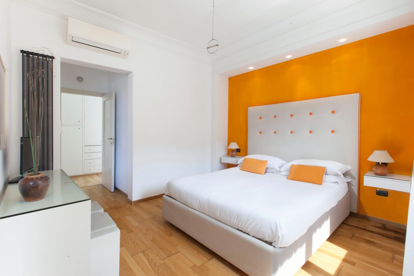 • Bedroom 1 with private bathroom: King-size bed, air conditioning and heating, TV, private terrace – Bathroom: Sink, toilet, bidet, bath with rainfall shower, hairdryer