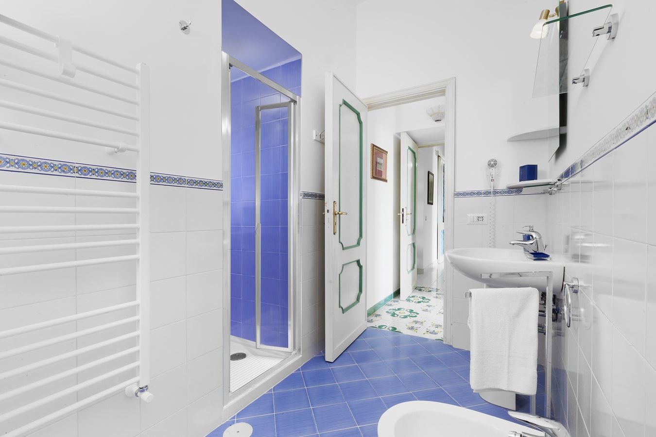 On the ground floor we find the large living area with sofas, armchairs, TV, antique furniture and a decorative fireplace. There is a separate studio with desk for those who need to work, a dining room with seating for 8 people that is accessed from the kitchen, a separate kitchen (equipped with a five-hob gas stove, an electric oven, an espresso coffee machine, a fridge with freezer, a microwave, a toaster, a dining table with chairs for four people and other small appliances) with direct access to the terrace, and a guest bathroom with sink, toilet and the washing machine (access from the kitchen).