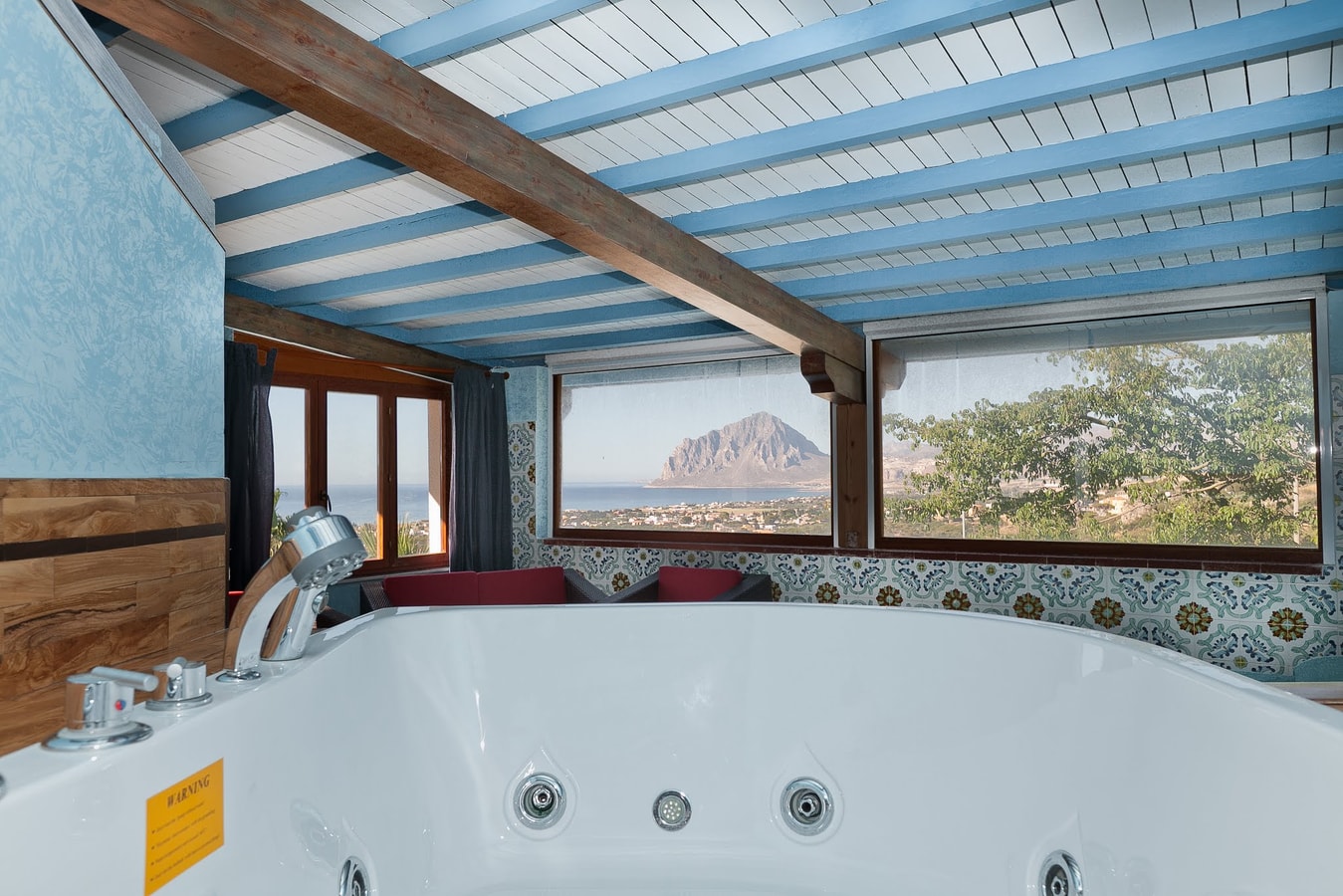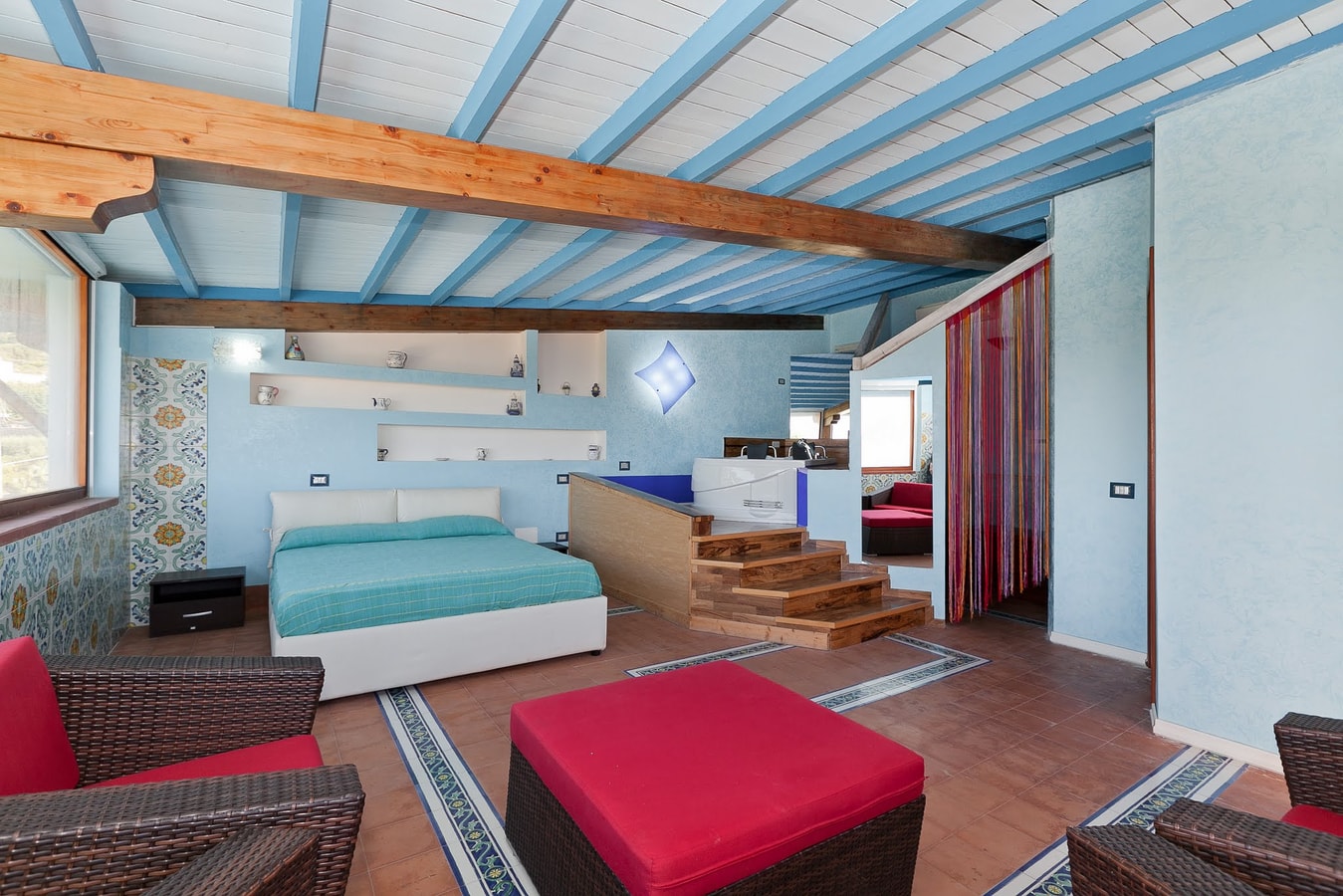 External stairs to second floor: large double bedroom with open plan double jacuzzi tub and bathroom with hydro massage shower.