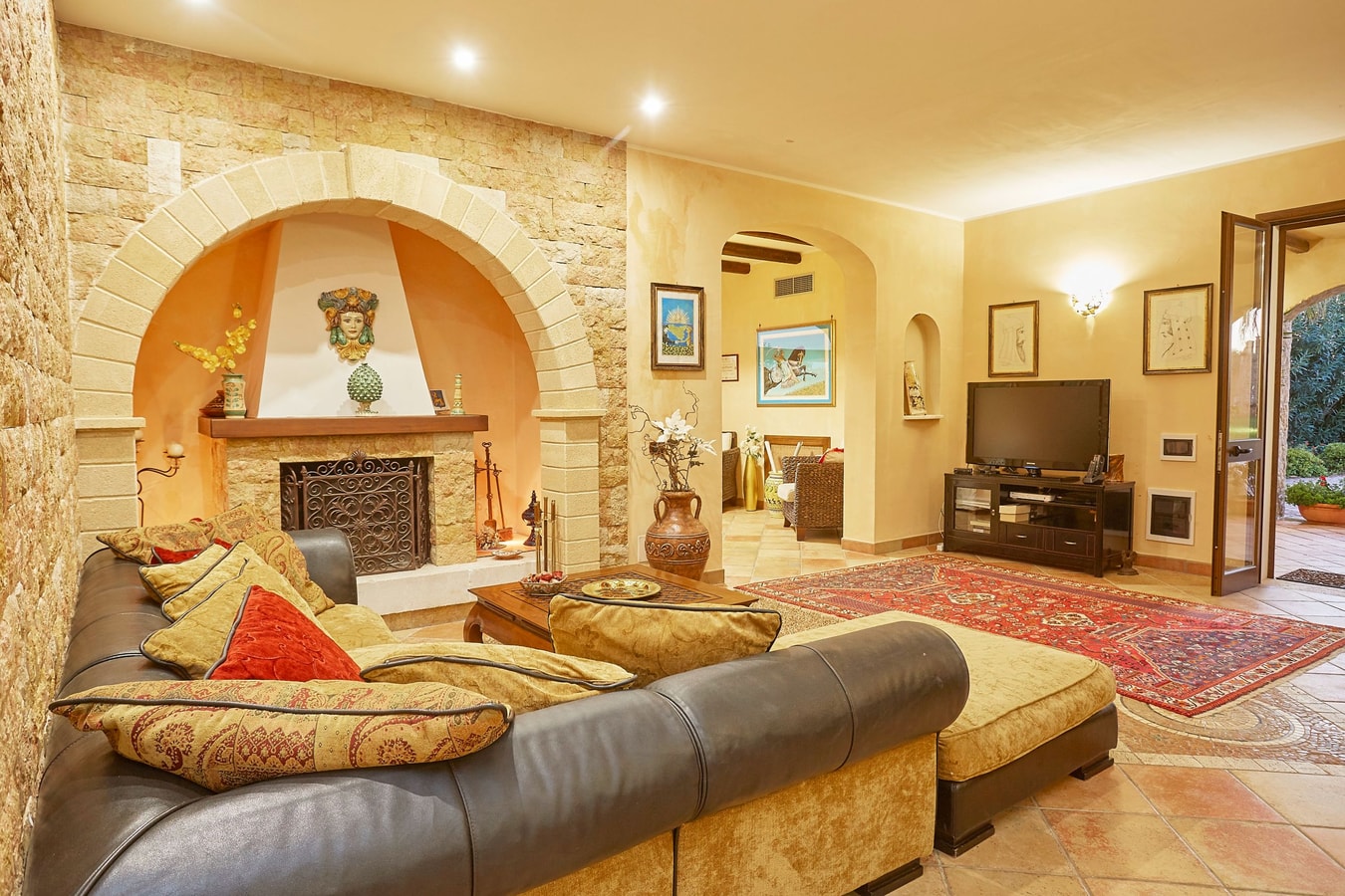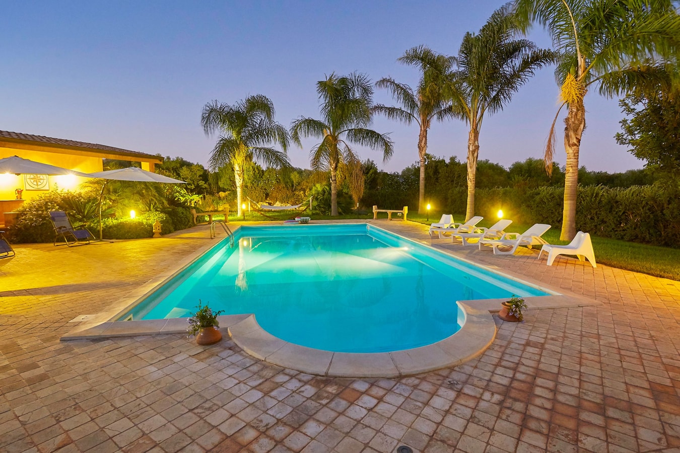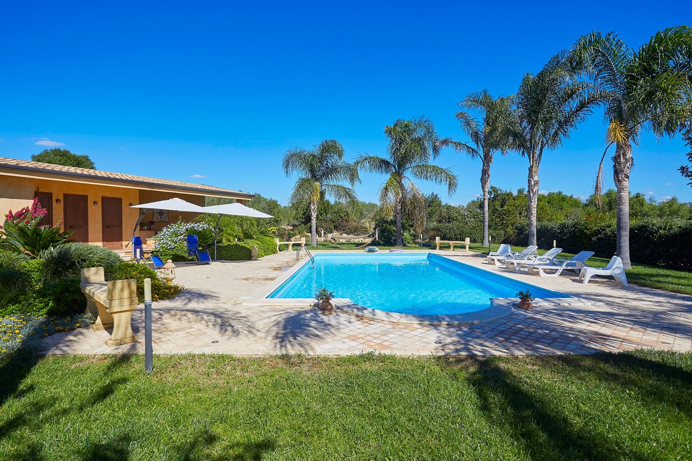 In the spacious garden there is a wonderful swimming pool (14m x 7 m , depth 1.2m - 2.5m) with sun lounges and umbrellas, a bathroom and two showers. There is also a covered patio with a barbecue and a table with the finest Sicilian majolica where guests can enjoy 'al fresco' dining. The garden is beautifully landscaped with typical Mediterranean shrubs, flowers, and palm trees.