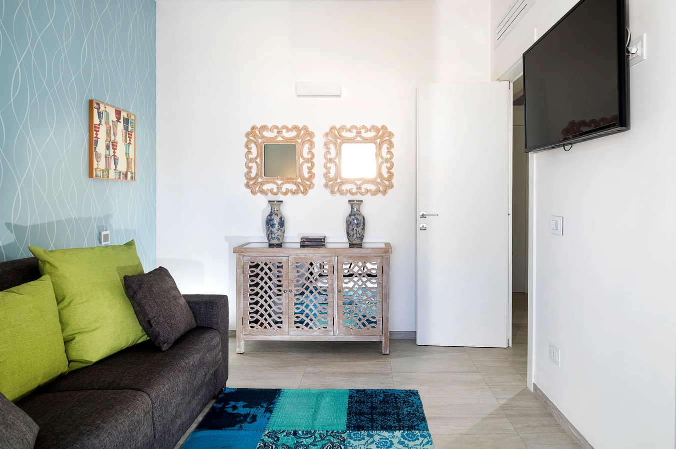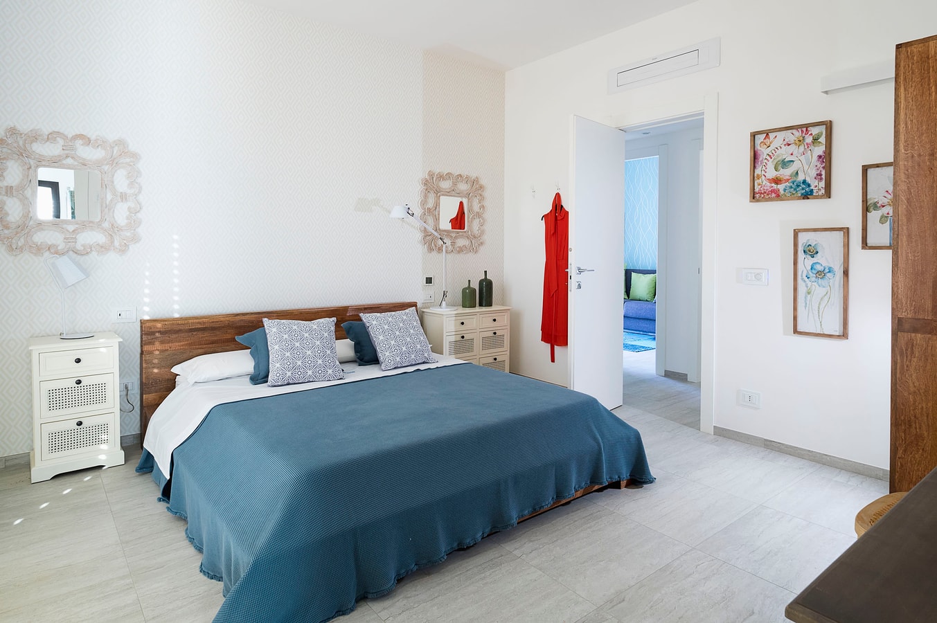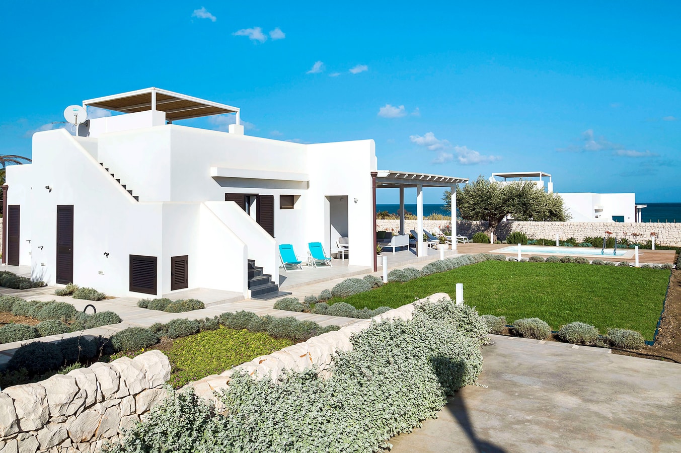 The villa develops over one level. Inside, we find the living room with large French doors that open directly onto the terrace, as well as the modern kitchen with dining table and chairs and doors that open to the outdoor space.
