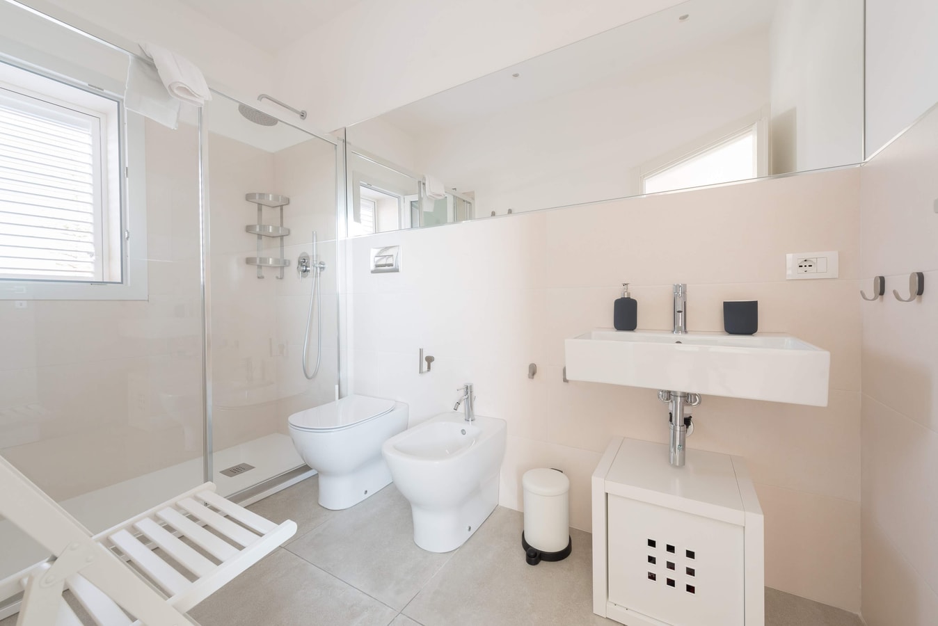 The sleeping area develops over the first and second floor and consists of three double bedrooms (with double beds) with ensuite bathrooms (with showers) and one twin bedroom (with two single beds) with ensuite bathroom (with shower).
