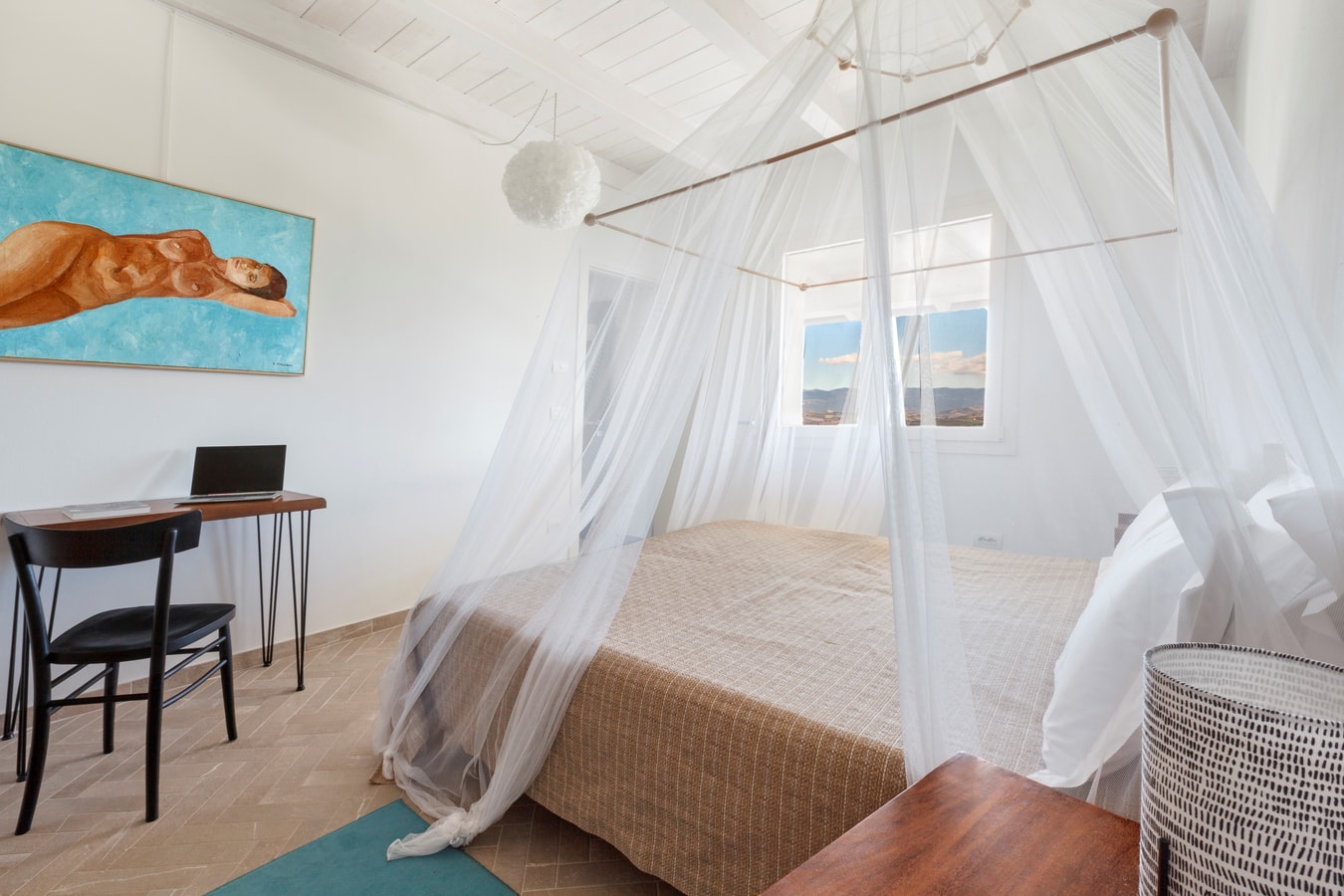 An internal or external staircase takes you to the upper floor (at pool level). Here you will find a well-equipped kitchen/dining room (with table seating 6) with access to the upper terraces. In the sleeping area you will find three twin/double bedrooms (with single beds that can be separate or joined together to form double beds), three bathrooms (with showers) and an office area (with desk and a large screen which can be connected to a laptop).