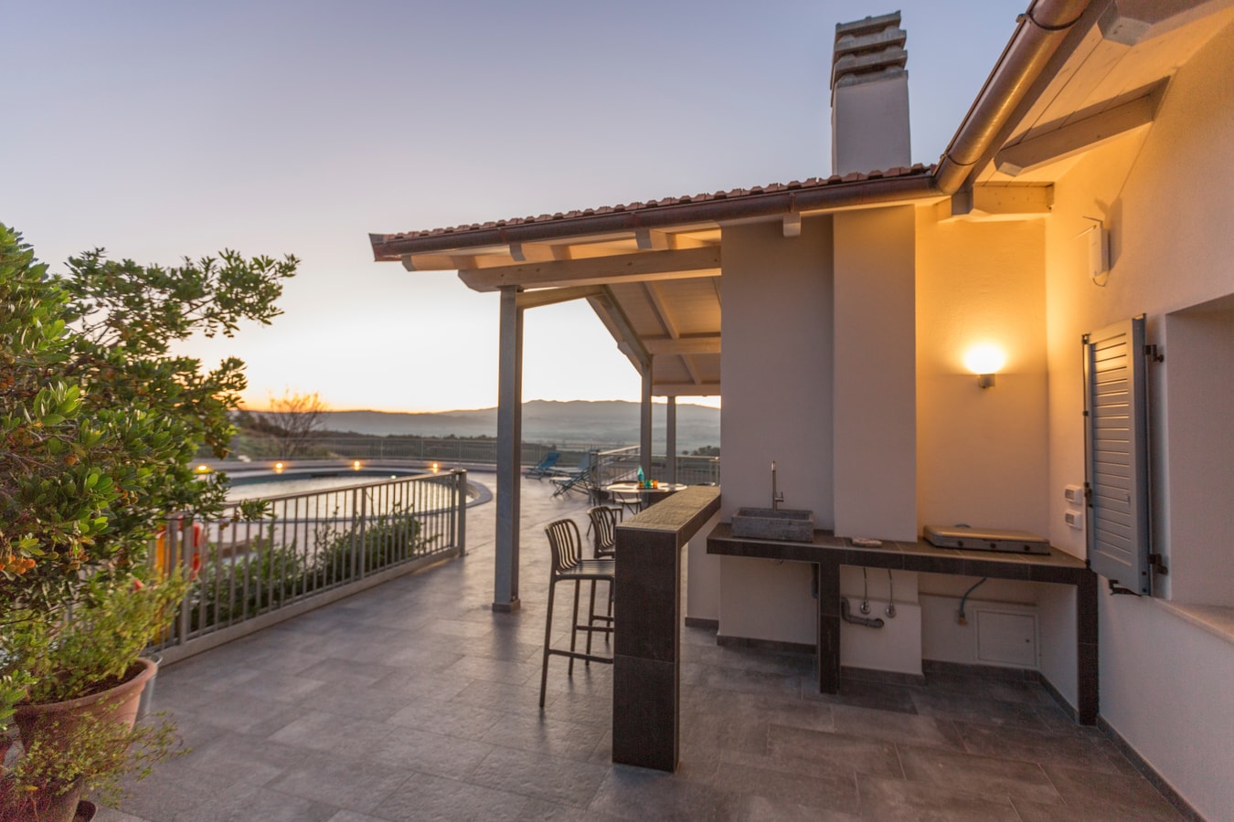 Outside, the villa is set in a terraced garden with a private swimming pool (5m x 8 m; open all year round; heated May – September), outdoor shower (with hot water) and a bar. You will also find an outdoor dining area (with table seating 6), an outdoor kitchen area (with barbecue and gas stove) and outdoor relaxation areas (with comfortable outdoor furniture).