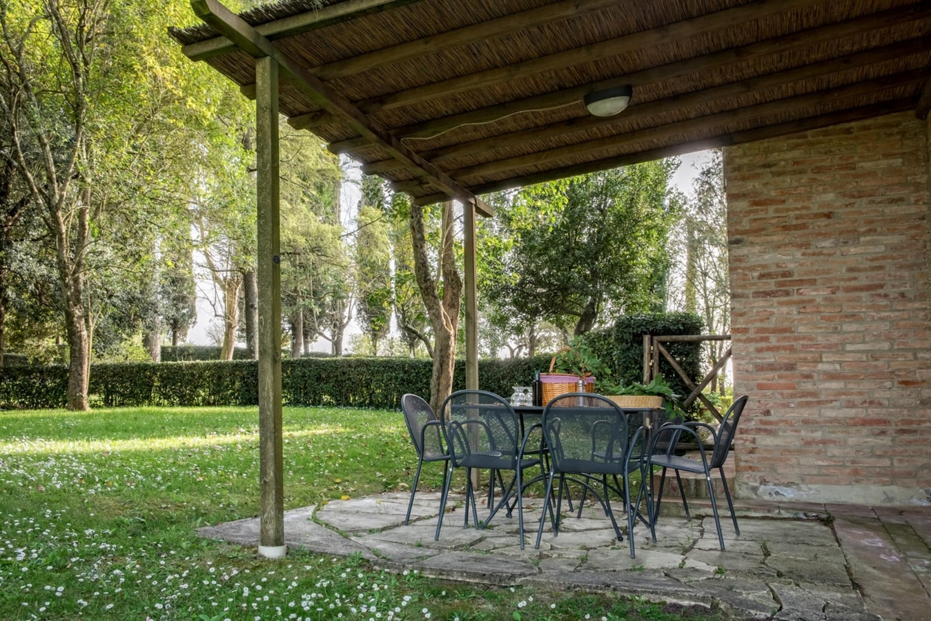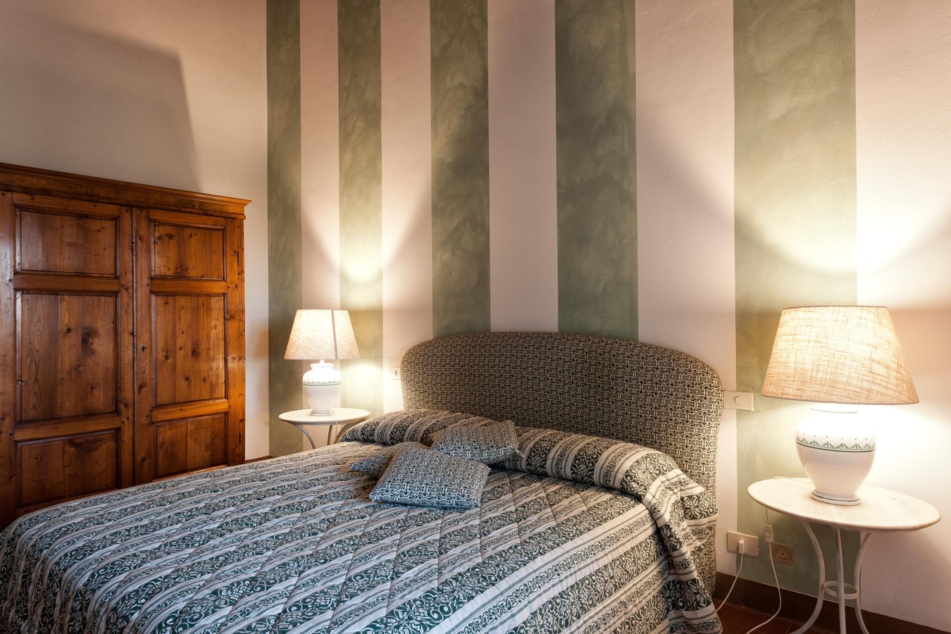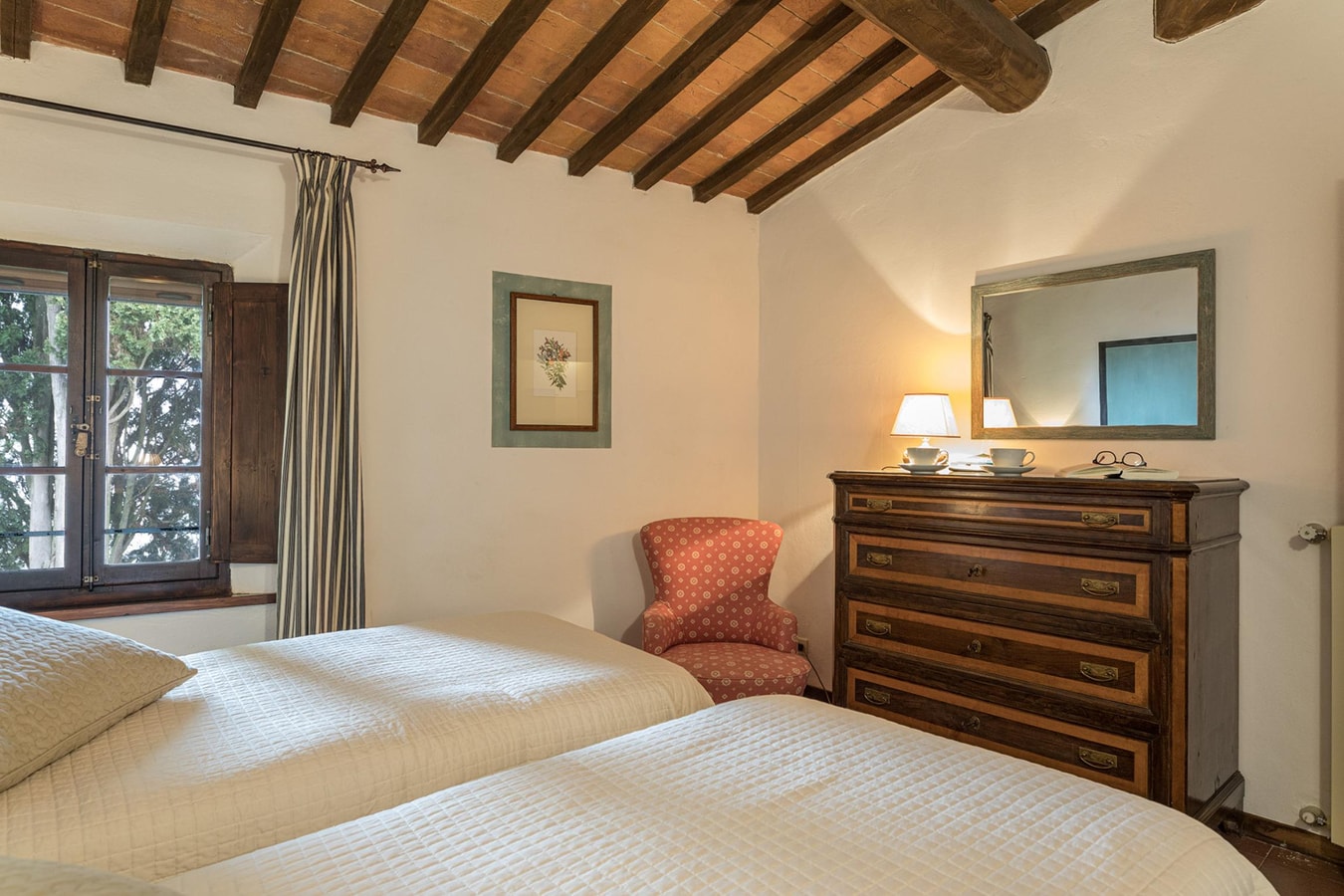 Outside, the villa faces a private 17th century chapel (still used for mass on Sundays) and is surrounded by a well-maintained garden with a private swimming pool (6 m x 12 m; depth 1.1 m – 2.4 m; open 16 April – 22 October). Around the pool, you will find a sun terrace (with sun loungers and umbrellas) and next to the villa, there is a shaded terrace (with table seating sixteen) for outdoor dining.