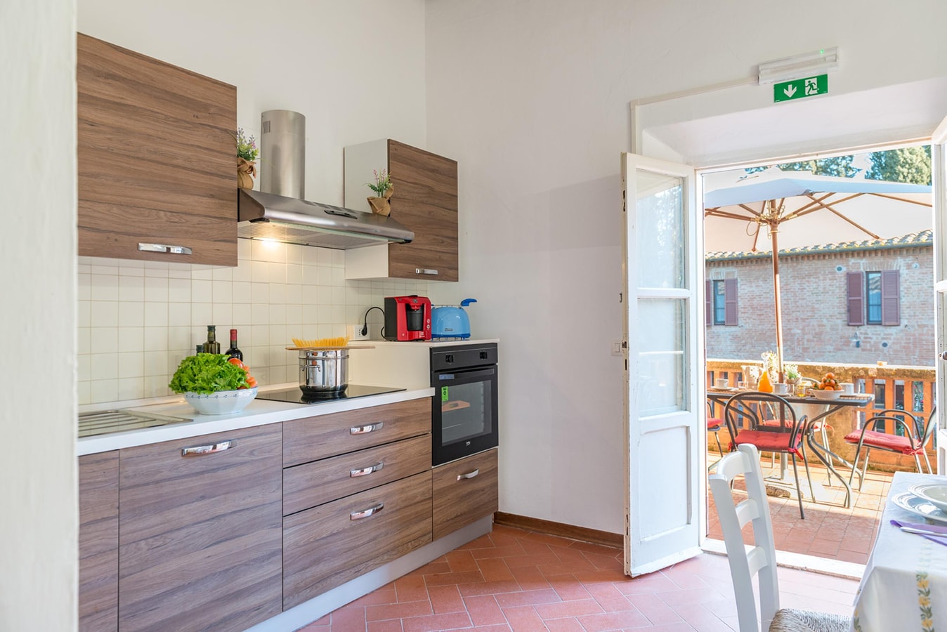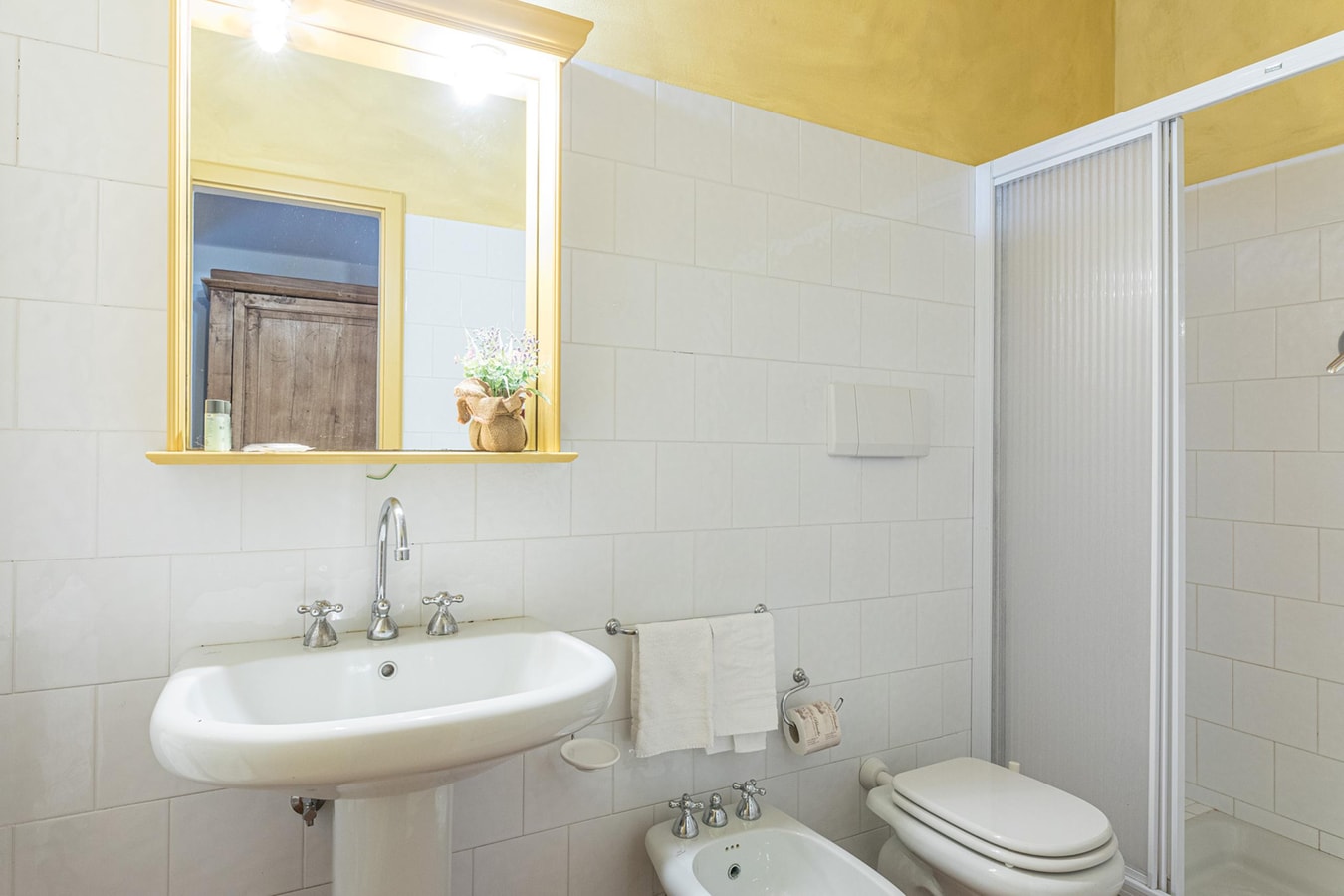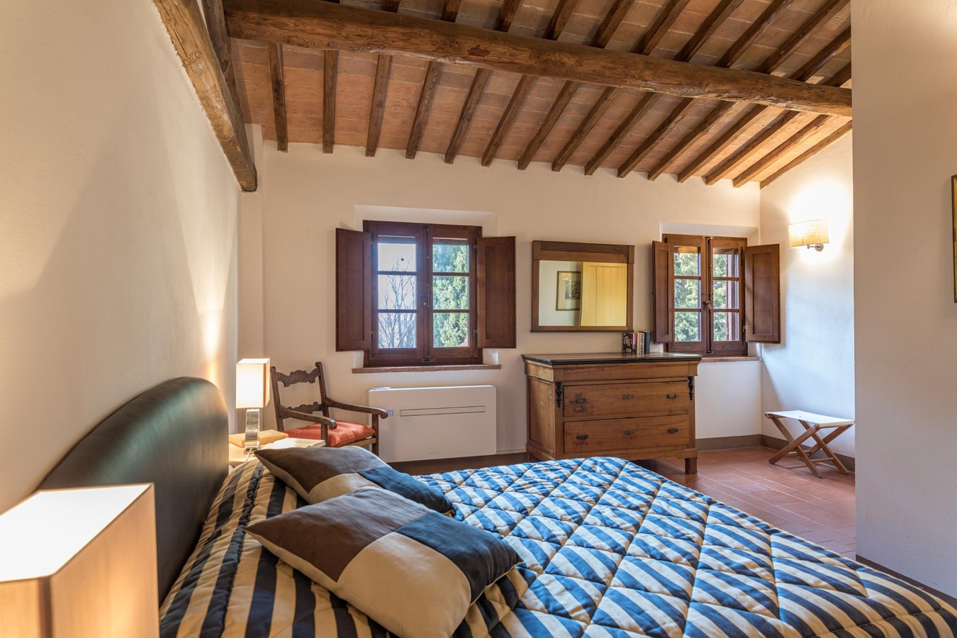 Outside, the villa faces a private 17th century chapel (still used for mass on Sundays) and is surrounded by a well-maintained garden with a private swimming pool (6 m x 12 m; depth 1.1 m – 2.4 m; open 16 April – 22 October). Around the pool, you will find a sun terrace (with sun loungers and umbrellas) and next to the villa, there is a shaded terrace (with table seating sixteen) for outdoor dining.